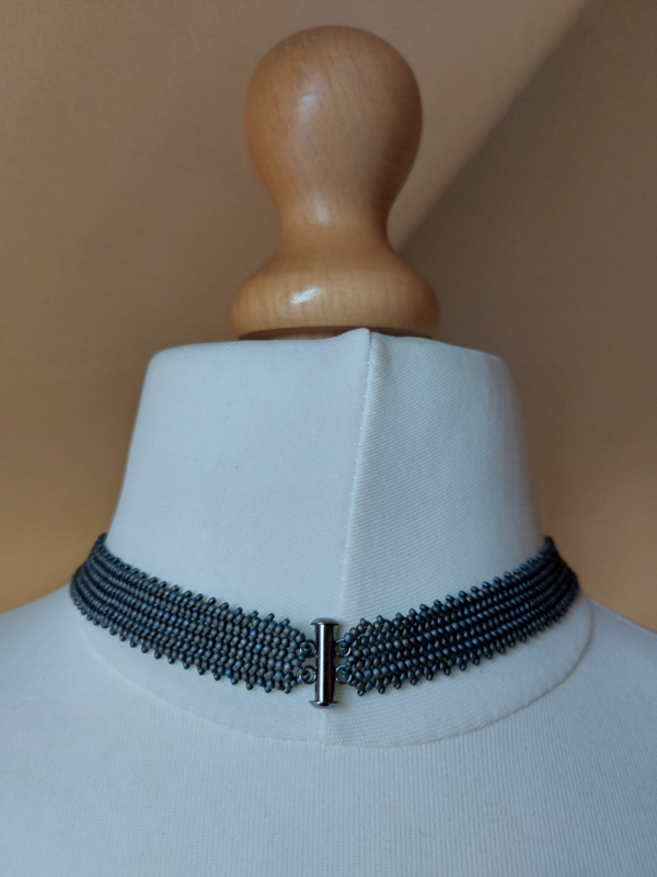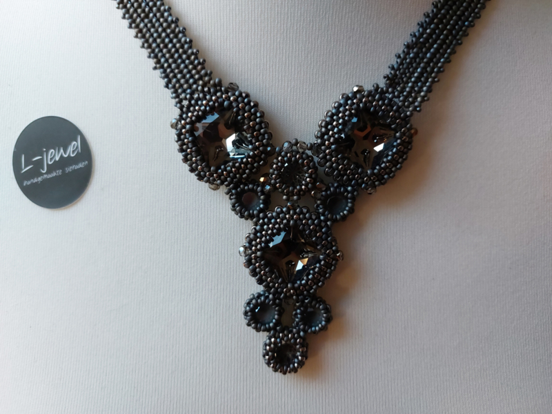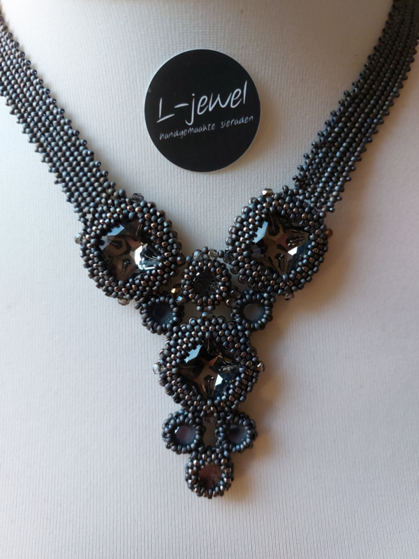 Artikelnummer: KK32 OverzichtPrachtige korte ketting naar een patroon van Monique de Boer. Deze ketting valt mooi om de hals In deze ketting zitten rocailles, delica's, swarovski chatons glas chatons zowel rond als ook vierkant. Kleur mat grijs met nikkel kleurige kralen. Schuifsluiting.