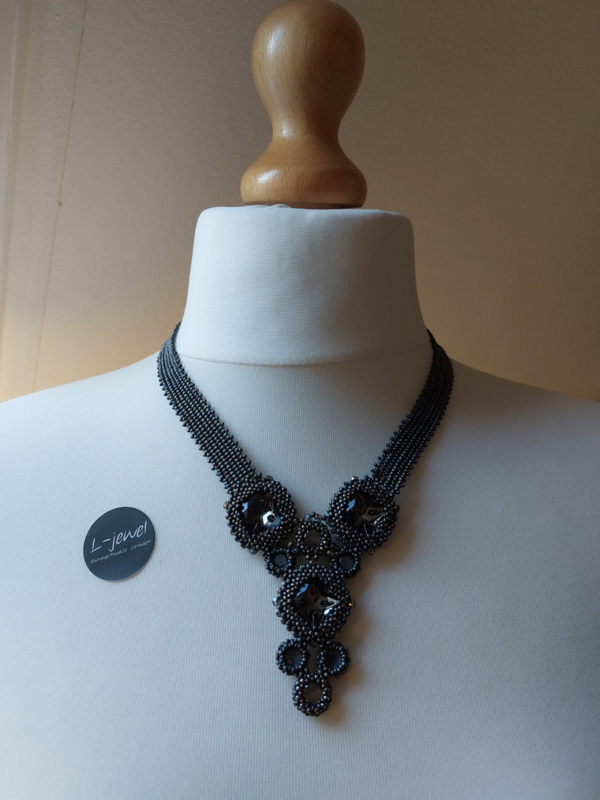 Bella (black)Prachtige ketting Bella. Patroon is van Wirwar kralen. De ketting bestaat uit allemaal losse lussen die aan elkaar verbonden worden. De ketting heeft in totaal 15 rivoli's in de kleur grijs. Midden onder hangt een prachtige glazen…